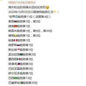10月5日下午,“肖战生日”登上国内微博热搜。“HappyXiaoZhanDay”话题也在全世界23个国家社交平台推特上榜:泰国、越南、韩国、缅甸、秘鲁、俄罗斯、新加坡等7个国家排名第1;孟加拉国排第2、墨西哥排第3……土耳其排47。相关词条内也是清一水的粉丝祝福。