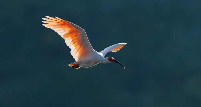 当朱鹮处在静止状态或者在地上觅食的时候,红色并不明显。而当它们打开翅膀,就能看到翼下漂亮的绯红色飞羽。对此有日本学者还曾提出过一种假说,认为朱鹮这样的红色羽毛可以起到保护色的作用,当朱鹮背对太阳飞翔时,它腹面的红色可以帮助它更好地隐藏飞行中的自己,远远望去就如同日光的反射,不易被下方的掠食者锁定。但很可惜,这个仅仅停留在猜想阶段,并没有任何证据可以证明它的正确性。