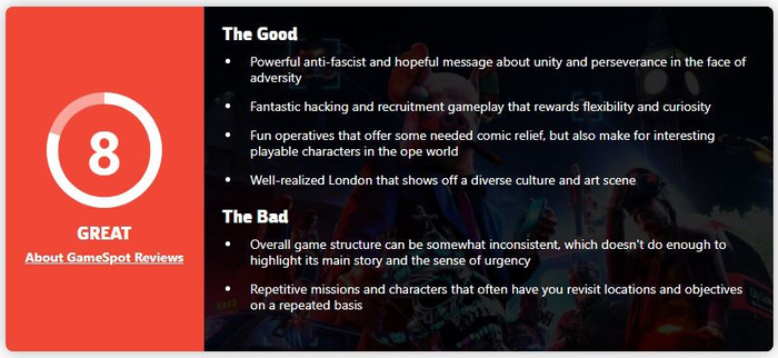 GameSpot 评分 8/10:关于在逆境中团结坚持的深刻主题,神奇的黑客招募系统,有趣的角色为游戏增加了喜剧效果,充分展示了伦敦多元化的文化和艺术场景。整体结构不一致,故事主线和紧迫感没有很好的呈现;重复的任务和角色。