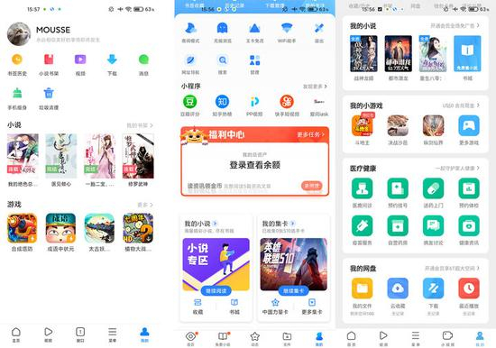 ▲ 八款浏览器都集成了视频、小说和游戏等功能,部分模块还直接放在了底栏