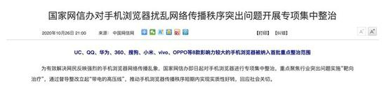10 月 26 日晚,国家网信办宣布,将对手机浏览器开展整治行动,重点放在了‘标题党’文章、低俗图文视频以及谣言信息等内容层面上。