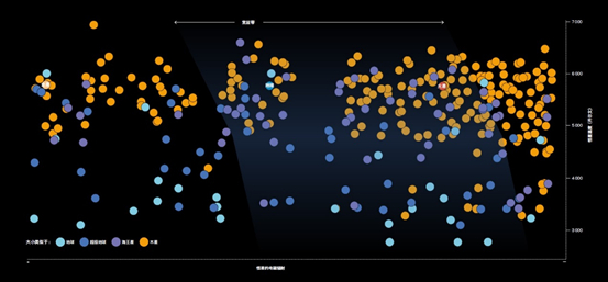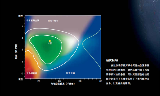 下图显示了银河系从诞生到现在的状况,以及天体与星系核心的距离。在星系形成初期以及离中心非常近的地方,金属含量太少,超新星太多,这些都阻碍了行星的形成。另一方面,在离星系中心太远的地方不会有足够的重金属形成岩质行星。所以,最佳宜居带不可能在银河系的早期就存在,也不可能太靠近它的中心。