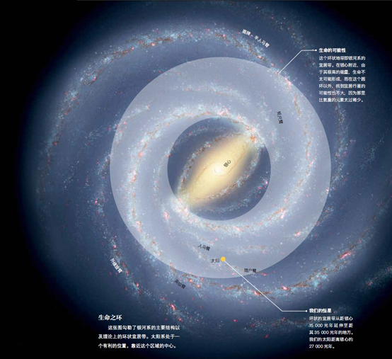 在银心附近,由于其极高的能量,生命不太可能形成,而在这个圆环以外,找到宜居行星的可能性也不大,因为那里比氦重的元素太过稀少。这张图勾勒了银河系的主要结构以及理论上的环状宜居带。环状的宜居带从距银心15 000 光年延伸至距其35 000 光年的地方。我们的太阳距离银心约27 000 光年。太阳系处于一个有利的位置,靠近这个区域的中心。