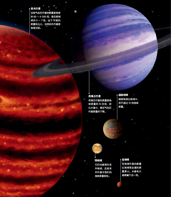 虽然每个类型的边界并不清晰,但系外行星大体上可以根据它们的质量分为5 类:“类木行星”——质量最大的系外行星,大小类似于木星,甚至更大;“类海王行星”——与海王星大小相似的系外行星;“超级地球”——大于地球小于海王星的系外行星;“类地球”——与地球质量相近的系外行星;“亚地球”——质量小于地球的系外行星。