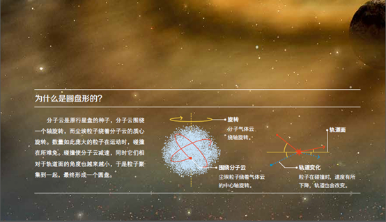 分子云是原行星盘的种子,分子云围绕一个轴旋转,而尘埃粒子绕着分子云的质心旋转。数量如此庞大的粒子在运动时,碰撞在所难免。碰撞使分子云减速,同时它们相对于轨道面的角度也越来越小,于是粒子聚集到一起,最终形成一个圆盘。