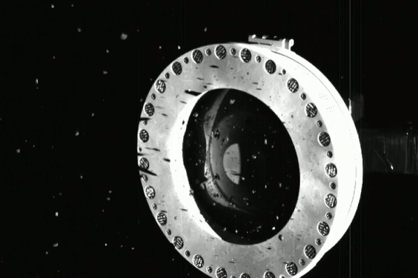 在行动结束约24小时后,NASA分享了航天器拍摄到的第一批触地行动图像。Tagsam移动到位置,在氮气的爆炸性爆发之前,它的采样头与Bennu的表面接触。操作过程中掀起了大量碎片,在采集臂周围飞舞。