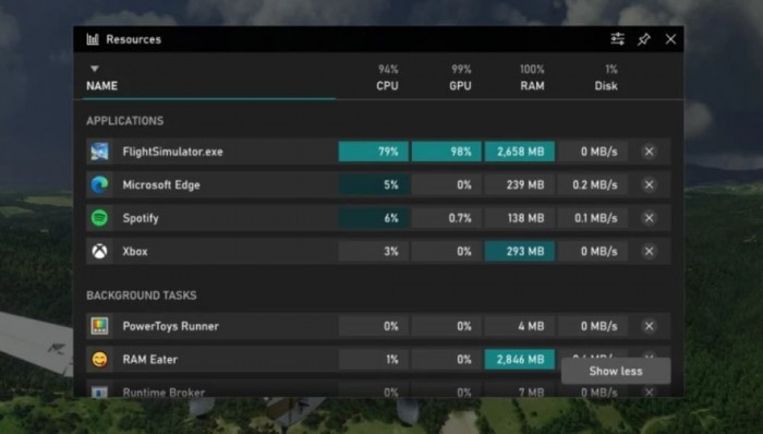 Game Bar 的资源监视器小部件和性能小部件同时使用,您可以启动这两个小部件来检查Windows 10在后台可能正在运行什么,并注意帧速率。如果发现某个应用正在占用大量RAM或GPU,则可以单击“ X”按钮,然后在此处结束该过程,而无需离开正在玩的游戏。