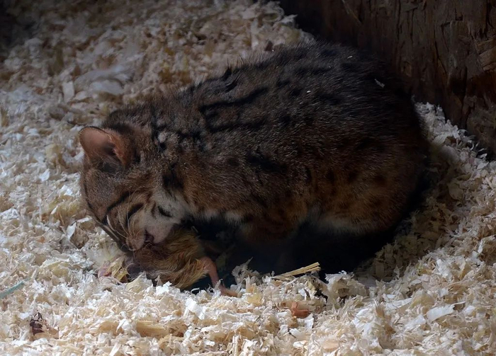 啃小鸡的锈斑豹猫。来自法国专注保护和繁育猫科动物的动物园Parc des Félins。图片:Vassil / Wikimedia Commons