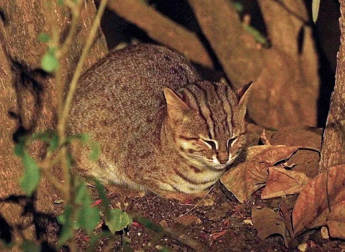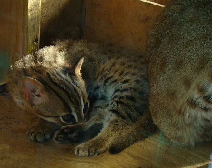 说到这里,又要讲点老生常谈了:锈斑豹猫可爱,但不能当宠物养。人类和锈斑豹猫的互动甚少,但和它同属的豹猫(P. bengalensis)已被人类强行“招募”了。具有华丽斑纹的孟加拉猫,就是在家猫中引入豹猫基因的结果。饲养孟加拉猫是合法的,但有人偷猎野生豹猫,作为猎奇的“宠物”出售。锈斑豹猫的另一个亲戚渔猫(P. viverrinus),也在非法宠物市场上出现过。