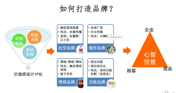那么到现在消费者买了我们的产品之后,怎么发展消费者跟产品、品牌之间的意义,就变得很重要。所以我们做的品牌营销,解决的其实是,符号识别系统,利益识别系统和意义识别系统的问题。