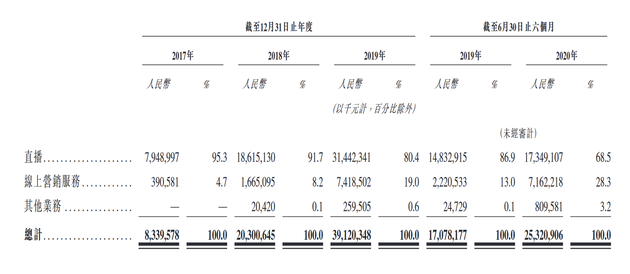 不过,快手直播收入占总收入的占比在逐年降低。招股书显示,比例已经从2017年全年的95.3%缩小至2019年的80.4%,2020年上半年已缩小为68.5%。这个比例相比较传统的直播平台较低。