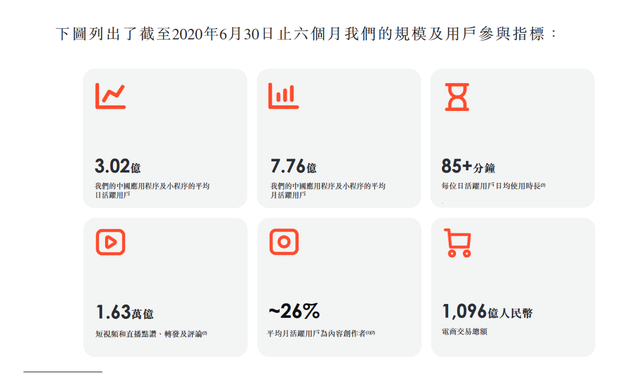 从快手招股书来看,截至2020年6月30日,快手应用日活2.58亿人,加上快手小程序数据,平均日活跃用户达3.02亿,月活跃用户达7.76亿。此外,到2020年8月,快手极速版日活跃用户突破1亿。