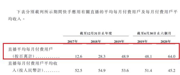 自2017年至2019年,快手直播业务的收入分别为79亿元、186亿元以及314亿元,2020年前6个月为173亿元。2020年上半年,快手直播平均每月付费用户达6400万,快手直播每月从付费用户获得的平均收入达45.2元。
