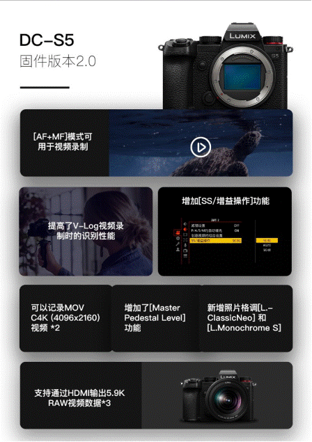 11月4日,松下更是发布了全画幅系列的重要固件更新,S5在视频参数方面有了巨大的提升,更是具备很多S1H的高级特性。基本已经具备了视频用户所需的特性,包括防抖、视频与操控体验等等。之前大家对S5的评价是“轻巧 · 全能”。升级V2.0固件后,这个评价就变成“轻巧 · 全能 · 够专业”。