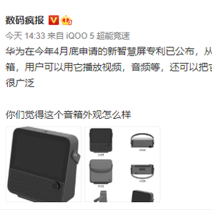据@数码疯报 消息称,华为在今年4月底申请的新智慧屏专利已经公布,该音箱可以播放视频、音频等内容,并具备触屏功能。