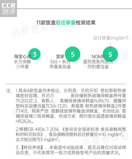 不过这3款饭盒的总迁移量都在安全范围内,未超过国标。只要不将盒盖放入微波炉中加热,消费者就可放心使用。