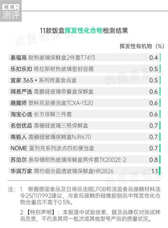 结果显示,仅泰福高、乐扣乐扣、宜家等3款饭盒的挥发性化合物含量低于或等于0.5%,其余8款饭盒的含量都超过0.5%,尤其华润万家的1款饭盒的盒盖胶圈检出挥发性化合物含量为1.1%,超过限值要求的2倍。