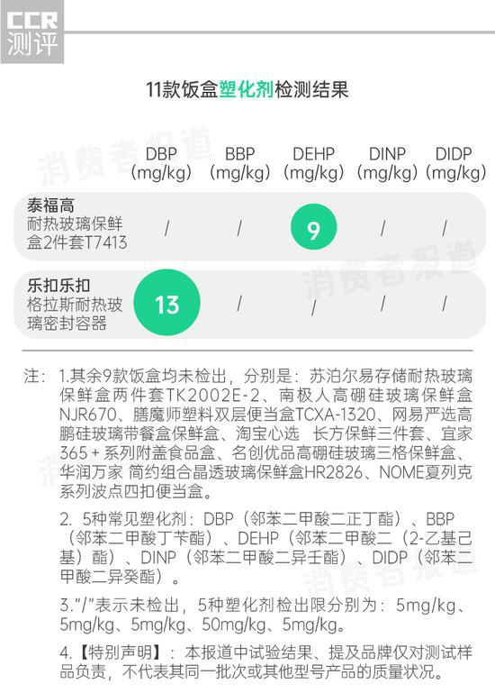 结果显示,11款饭盒中,乐扣乐扣、泰福高等2款饭盒的盒盖检出微量塑化剂,含量为分别为13mg/kg、9mg/kg,其余9款均未检出塑化剂。