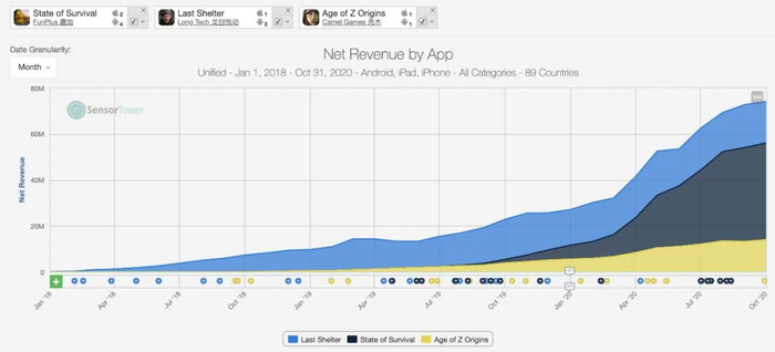 在2019年11月榜单我们曾报道过,受影视文化影响,末日题材在海外拥有规模可观的粉丝群体。进入2020年,在疫情全球爆发的大背景下,末日生存游戏似乎更容易让玩家获得代入感,榜单中三款手游收入亦迎来大幅增长。