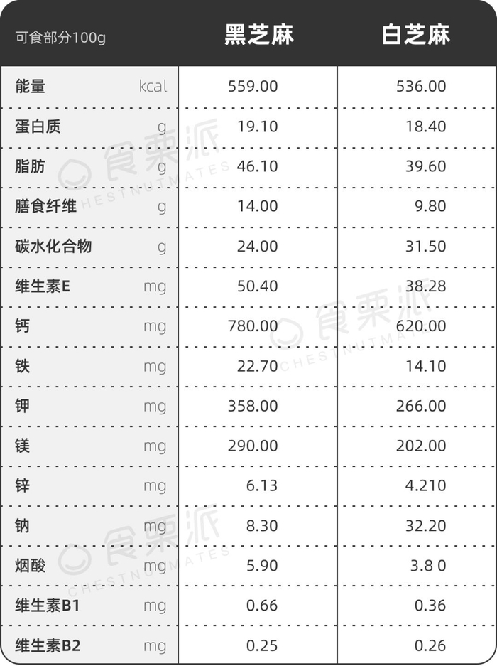 这样看,黑芝麻的确比白芝麻要优秀一些,但鉴于一天只能吃一小把(不超过20g),TA们之间差的这点儿营养成分,可以忽略不计了。