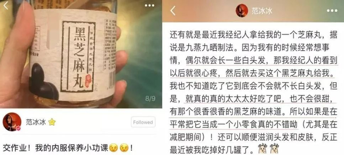 不少商家把「范冰冰说吃黑芝麻丸养发」当做噱头。小栗子查了出处,发现是这么回事——