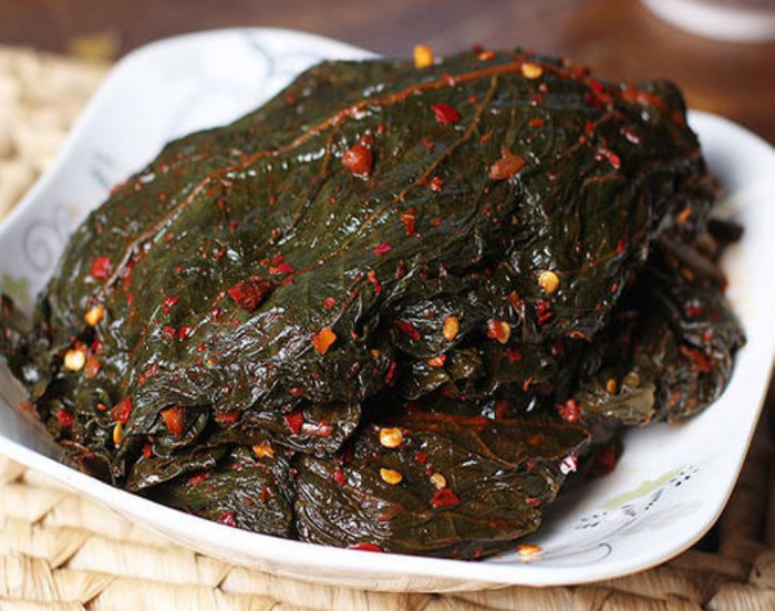 腌苏子叶,植物紫苏的叶子,有一种很特殊的香气,与肉类同煮能增加风味,属于“我之蜜糖彼之砒霜”的食材。吃的时候配热乎的白米饭最佳,把一片叶子平铺在米饭上,筷子向下用力,连同米饭一块夹起送进嘴里。白净的米饭裹着咸辣的苏子叶,味道不再单调。