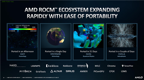 AMD ROCm生态的进步速度非常快,已经有众多领域的头部厂商采纳和支持,而且它沿袭了AMD一贯的原则,那就是完全开源开放,非常方便代码迁移,比如说HACC(宇宙学)只用了一个下午,SPECFEM3D(地震学)半天就搞定,CHOLLA(天体物理学)花了几天,QUDA(量子物理学)也不过21天。