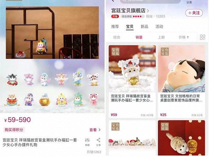 宫廷宝贝为原创潮玩设计品牌,主要设计和制作传统文化古风类型潮玩产品。宫廷宝贝和故宫淘宝合作,现已推出故宫猫系列盲盒以及毛绒神兽系列产品。宫廷宝贝依托故宫文化,以故宫太和殿脊兽、青铜莲鹤方壶等故宫文物为原型,制作了祥瑞系列故宫猫盲盒,“双11”期间销量较高。