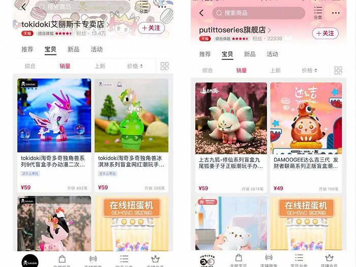 在putittoseries旗舰店,店内在售盲盒共有两款总销量超过10000件,其中上古九狐修仙系列盲盒(59元)共售出17572件,蜜桃猫系列的蜜桃猫2让爱先行系列盲盒(59元)售出12836件。