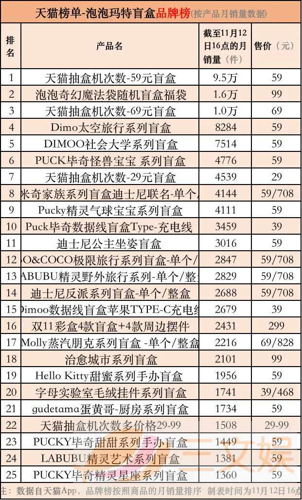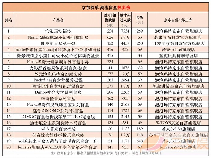 (注:因官方榜单的统计规则,部分热卖产品未被京东、淘宝计入榜单。如,预售2.5万件当天售罄的Molly的一天系列,未补货上线的Molly职业系列2盲盒,官宣销售额过千万元的阴阳师盲盒单品等)