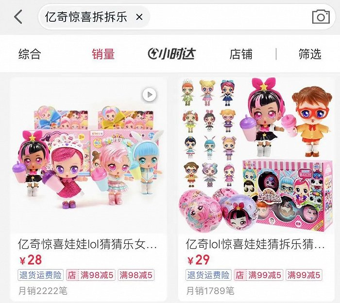 不管是在淘宝,天猫还是京东,只要以“亿奇惊喜”为关键字检索,就会出来几十上百家店铺在售的“亿奇惊喜猜猜乐”“亿奇惊喜拆拆乐”“亿奇惊喜百宝箱”......