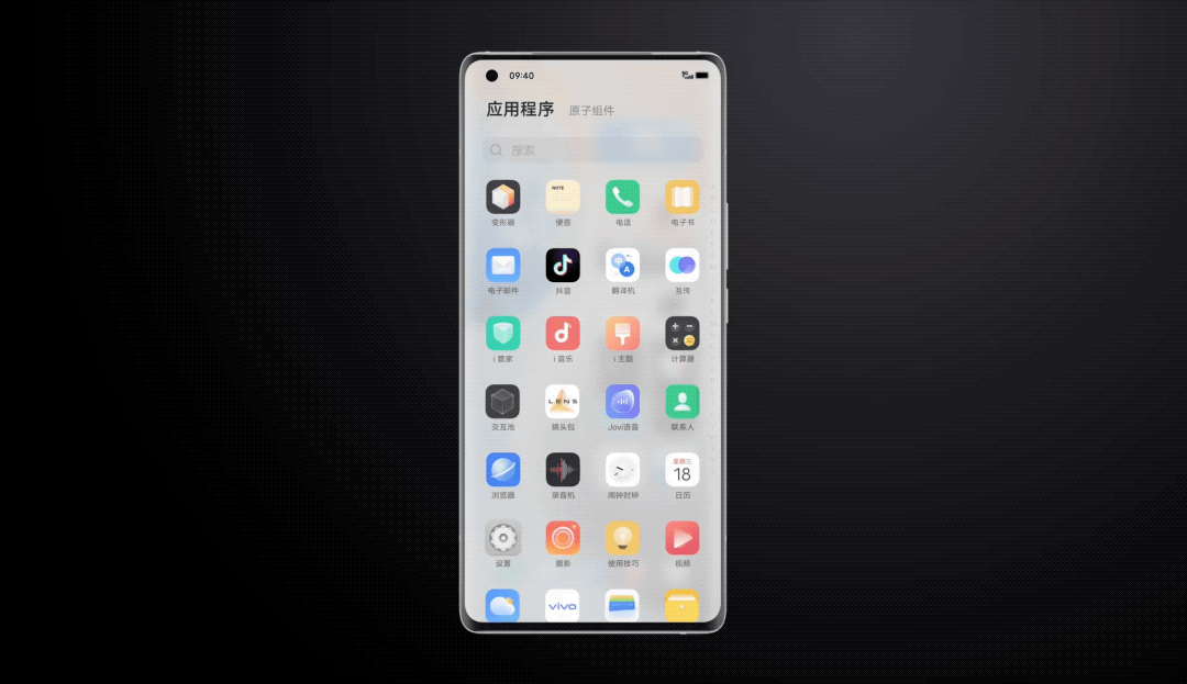 OriginOS搭载了全新桌面网格体系,另外还有原子通知、原子随身听、原子组件库、导航手势等。
