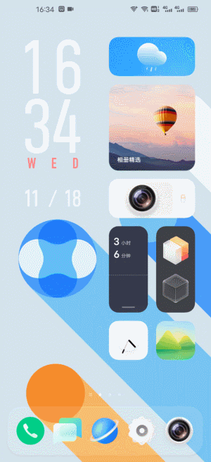 前面提到的像相机组件,是1*2的样式,长按则有“分离组件”,点击可以将两个组件分开成两个单独类似图标大小的组件,其实就相当于两个APP,反之,长按也可以合并组件。