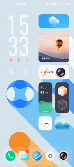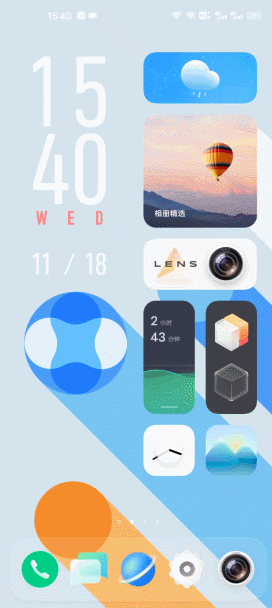 比如相机组件,左侧为“LENS”字样右侧为相机图片,两者整个为一个组件,点击左侧“LENS”便会出现各种相机功能,包括拍照、长焦、超广角等,这些可以自设置里进行设置,将日常常用功能展现在第一层。