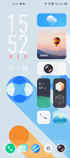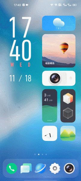 还有像天气、屏幕使用时间等组件可以直接在桌面的组件上上下滑动操作,比如天气组件不同日期或者一天不同时段的气温变化,不同天气组件组件界面也会相应变化,雾霾天气就会变成灰蒙蒙的,晴天的晚上就会晴空万里,晴朗白天则会一片蔚蓝,会根据白天晚上和天气进行实时变化。