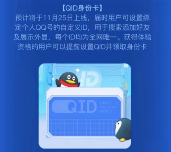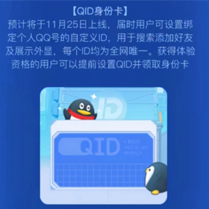 日前,手机QQ更新到v8.4.17版本,带来了群聊三件套:幸运字符、资料卡展示王者战绩、消息可多选设为群精华。据爆料,QQ目前正在内测QID功能,预计会在11月25日上线。届时,用户可设置绑定个人QQ号的自定义ID,用于搜索添加好友及展示外显,每个ID均为全网唯一。获得体验资格的用户可以提前设置QID并领取身份卡。