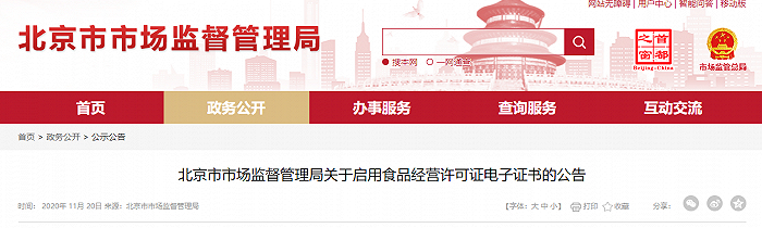 11月20日,北京市市场监督管理局网站发布《关于启用食品经营许可证电子证书的公告》。