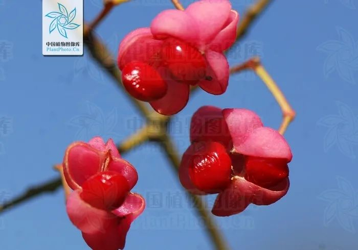 白杜粉红色的果实裂开,露出红色的假种皮。图片:周繇 / PPBC植物图像库