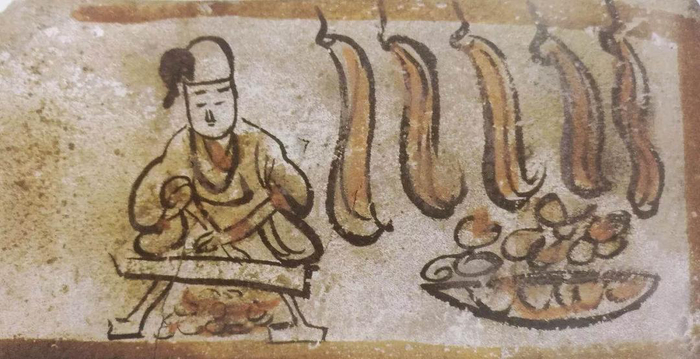 根据《礼记》《论语》等典籍中的记载,当时人以“束脩”——也就是十条干肉,用作相互馈赠的礼物,这说明将肉风干的做法起源很早,先秦时就有了。这样的历史信息,在甘肃省嘉峪关出土的魏晋墓葬壁画砖也有记录。