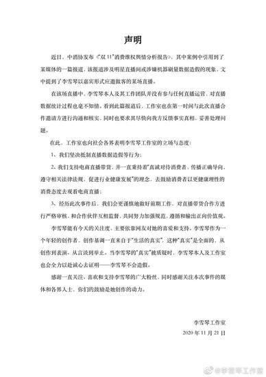 据此,李雪琴工作室发布声明,表示李雪琴本人及工作团队未参与任何直播运营,对直播数据统计过程毫不知情。并表示将坚决抵制直播数据造假行为,支持电商直播带货,秉承真诚对待消费者、传播正确导向、遵守相关法律法规、促进行业健康发展的理念。