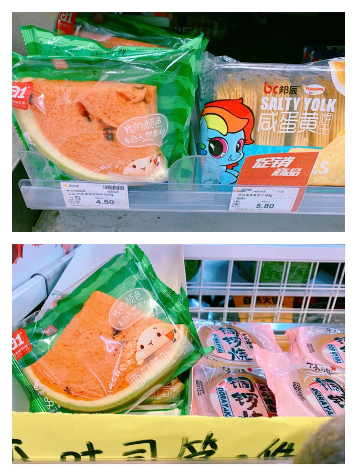 再来到便利蜂烘焙区域的货架,我们开始并没有发现这款产品,经询问店员后,得知这款产品一周前就已经上架了,如今又被系统推荐到货价的最底端。