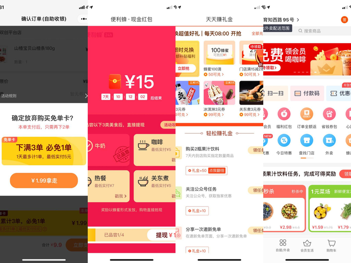 便利蜂APP上有很多专属折扣,包含通用满减券、外卖通用券、订单全额返、邀好友免单等多种玩法。一位消费者告诉我们,APP上还有很多签到、做任务赚礼金的游戏,而且都是很实在且易得的优惠。