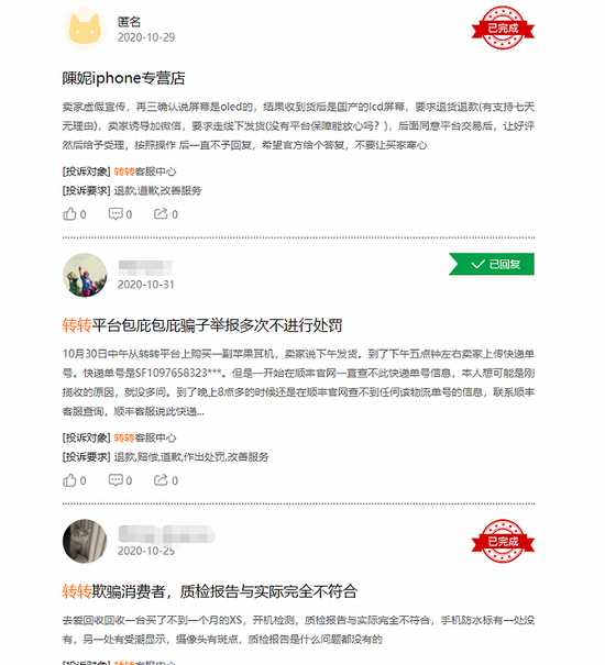 类似的售假情况在转转平台并非个例。黑猫平台上,转转APP的投诉总量已经超过20000条,其中很多内容都和电子产品售假等产品质量问题有关。