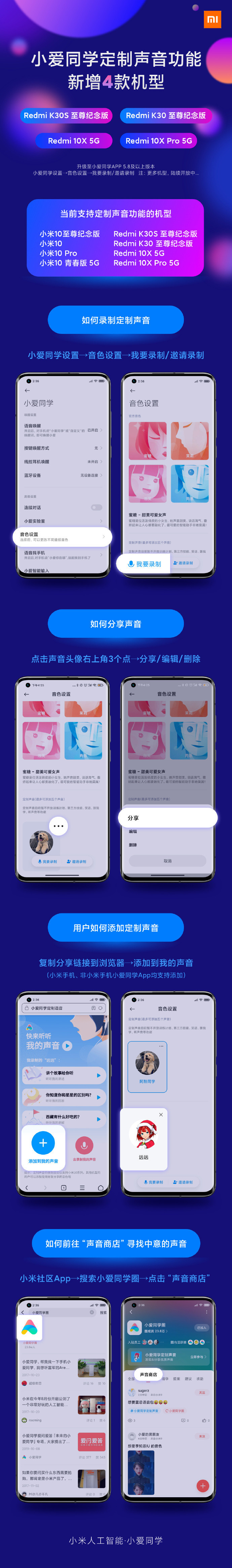 除了以上四款新增机型外,目前支持定制声音功能的机型还包括小米10至尊纪念版、小米10、小米10 Pro、小米10青春版5G。想要设置的小伙伴,可以在小爱同学APP内点击音色设置,我要录制/邀请录制,点击声音头像右上角3个点,分享/编辑/删除即可操作;复制分享链接至浏览器,添加我的声音即可添加定制声音;在小米社区APP搜索小爱同学圈,点击声音商店即可寻找中意的声音。