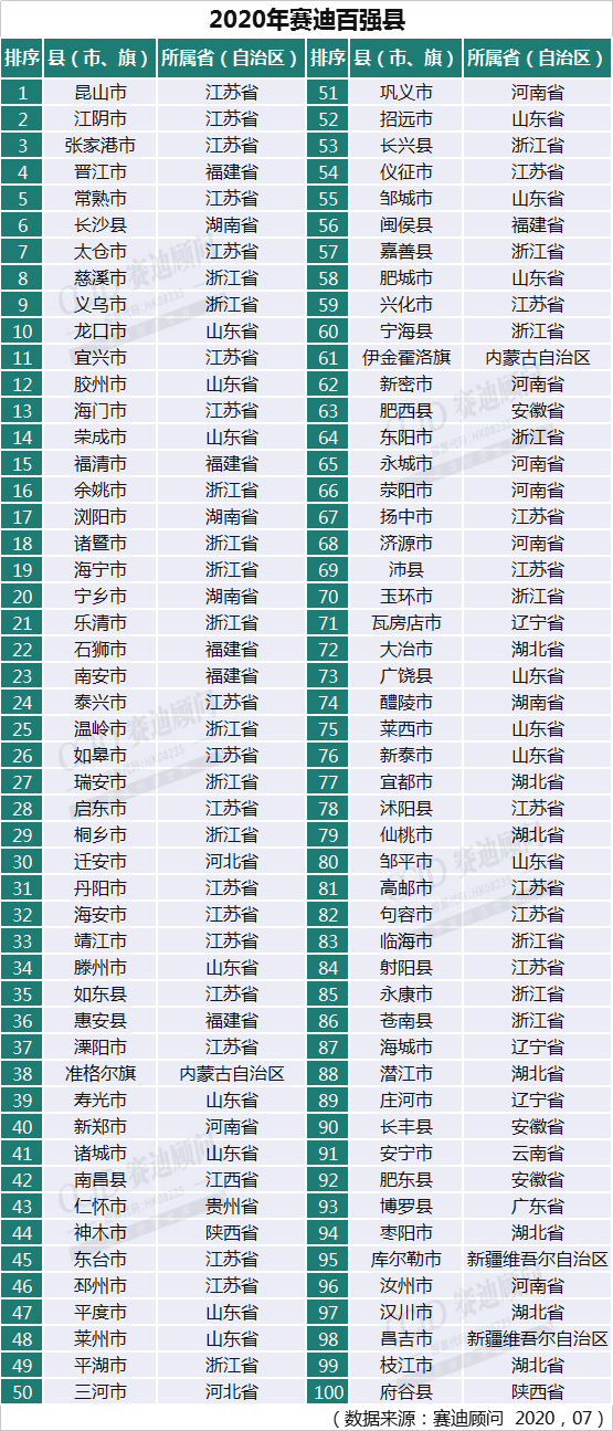 2020年中国经济百强县榜单 图片来源:《2020中国县域经济百强研究》