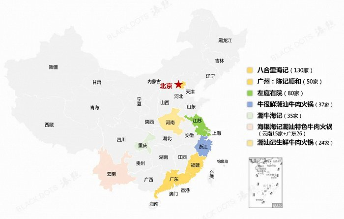 中国部分潮汕牛肉火锅品牌地理分布数据按各品牌所在城市门店数量进行粗略比较