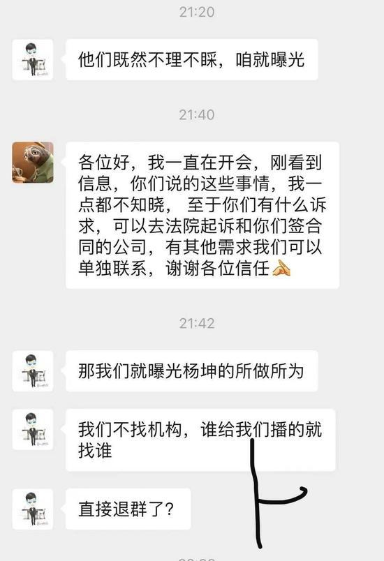 然而在胡浩提供的一个微信聊天截图中,杨宇与一众商家已经就直播带货的结果有过交涉。直播结束后,杨宇和商家在同一个微信群,小龙说:既然不理不睬,咱就曝光。”杨宇回复:“你们说的这些事情,我一点都不知晓,至于你们有什么诉求,可以去法院起诉和你们签合同的公司。”