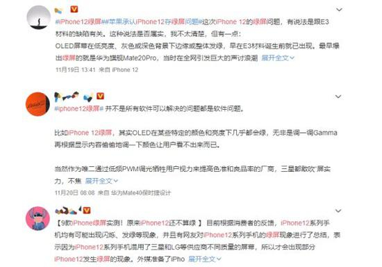 很多选购了iPhone12的网友也在社交平台对产品进行了吐槽,不少消费者期望“iPhone12出现绿屏能退机”;也有网友希望官方能够给与免费换屏。当然,也有网友针对手机绿屏问题变身名侦探“柯南”,从屏幕来源思考为什么会绿,小屏OLED会变绿屏,那大屏OLED电视会不会这样?