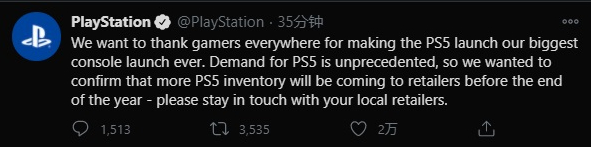 近日,PlayStation在官推上宣布,感谢世界各地的玩家,让PS5成为索尼有史以来首发销量最高的游戏主机,同时,索尼将会在年底前向世界各地零售商补货,请玩家与当地的零售商保持联系。