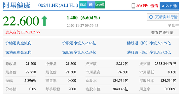 新浪科技讯 11月27日上午消息,阿里健康港股开盘涨1.4%开盘价报21.5港元,截止发稿,阿里健康涨幅扩大至6.6%报22.60港元,市值3040.46亿港元。